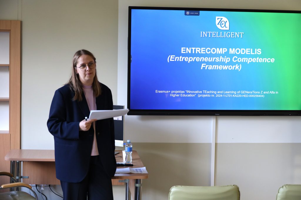 Laima Paraukienė, VIKO Verslo vadybos fakulteto Mokymų ir bendradarbiavimo plėtros skyriaus vedėja, pristatė ENTRECOMP – Europos verslumo kompetencijų ugdymo modelį, kuris yra viena iš metodinių atramų Erasmus+ projekto „INTELLIGENT: INnovative TEaching and LearnIng of GENeraTions Z and Alfa in Higher Education“ (projekto Nr. 2024-1-LT01-KA220-HED-000256404), koordinuojamo Vilniaus kolegijos. Diskusijų metu nagrinėta, kaip šis modelis gali padėti efektyviau vertinti Z ir Alfa kartų verslumo kompetencijas bei gerinti studentų supratimą apie verslumo ugdymą.