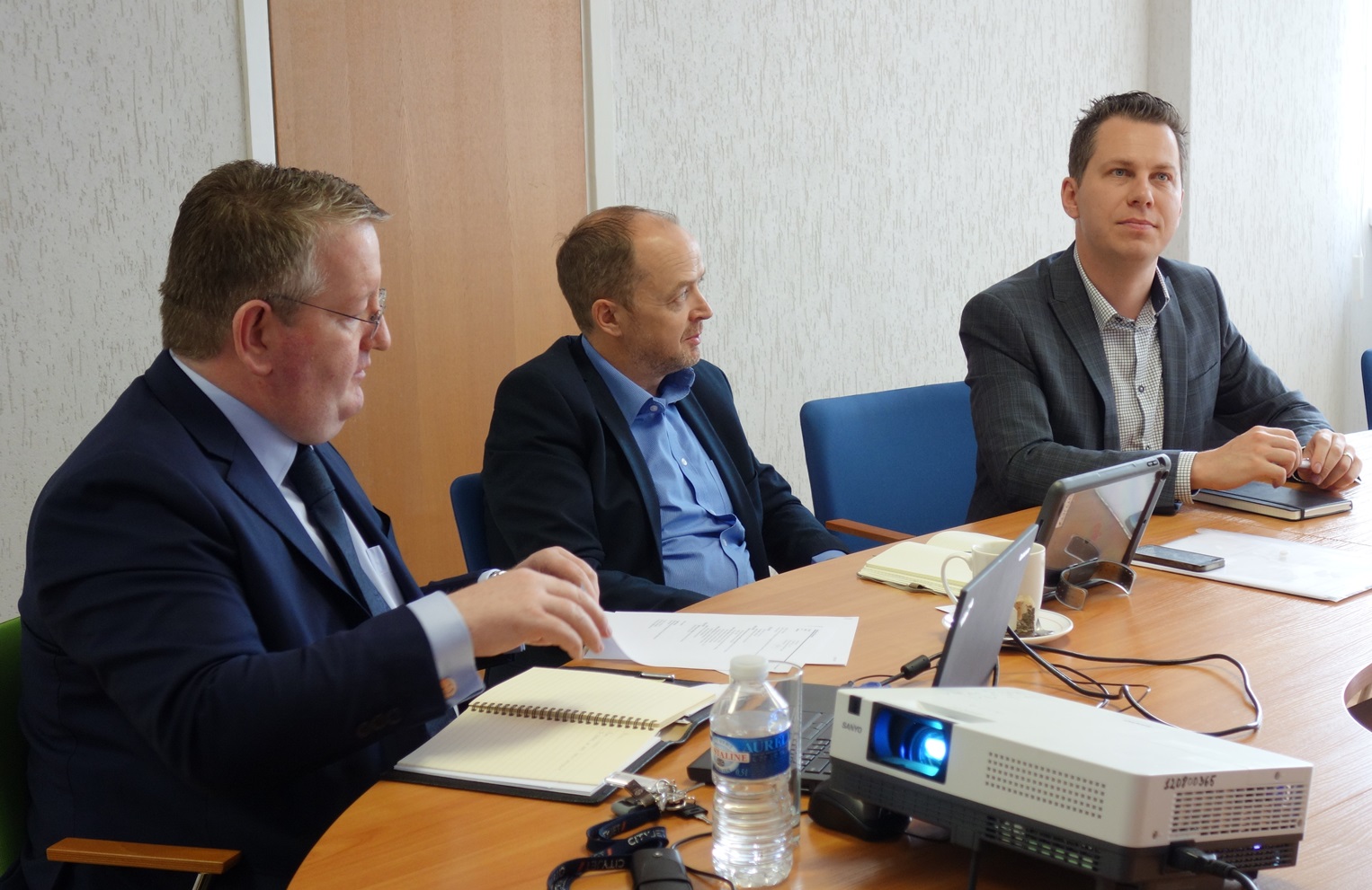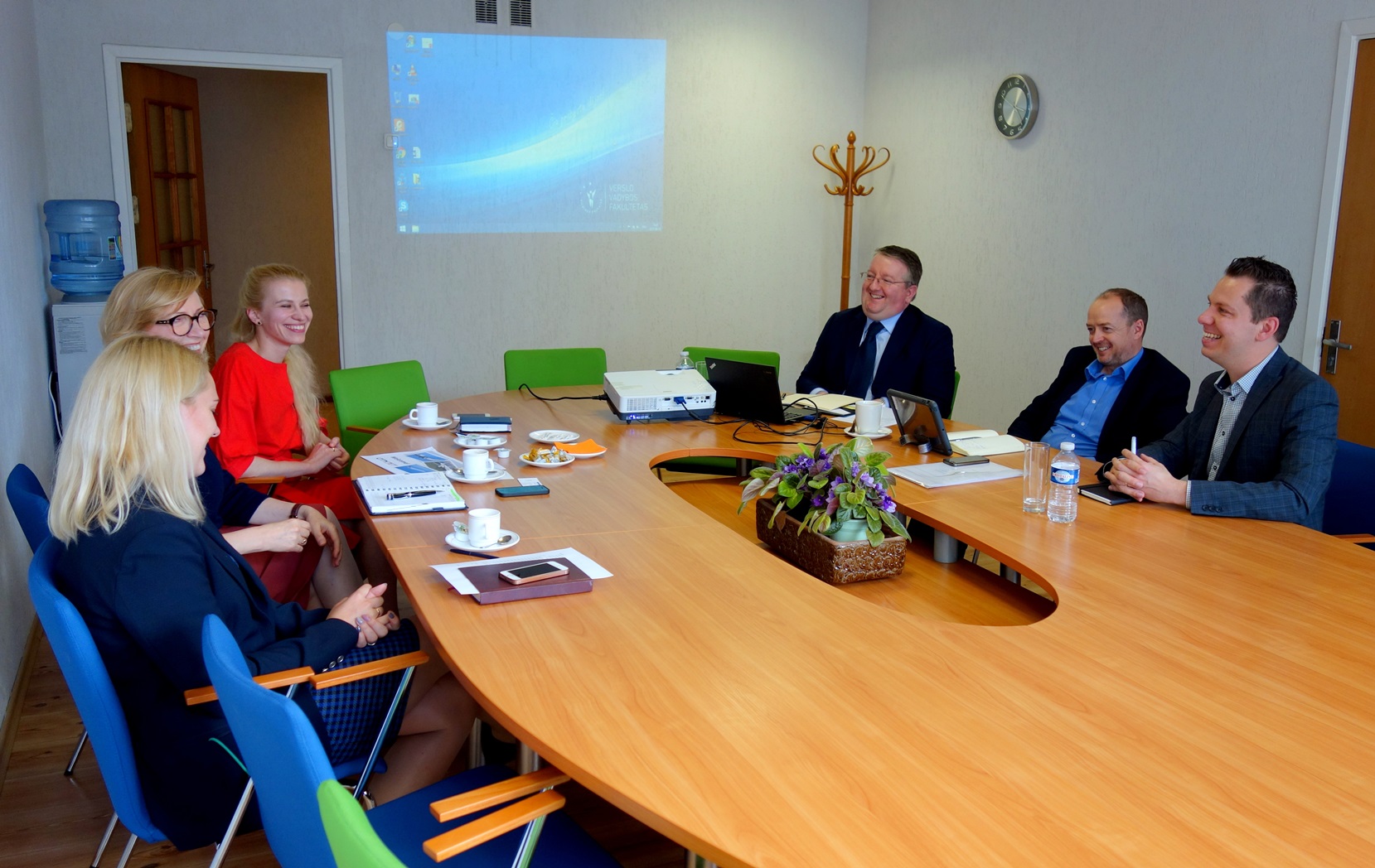 Vakar fakulteto dekanė, turizmo katedros atstovės ir aviacijos kompanijos „CityJet“ atstovai: Anthony Brennan, Robert Tatten ir Tautvydas Pocius sutarė dėl būsimo bendradarbiavimo.