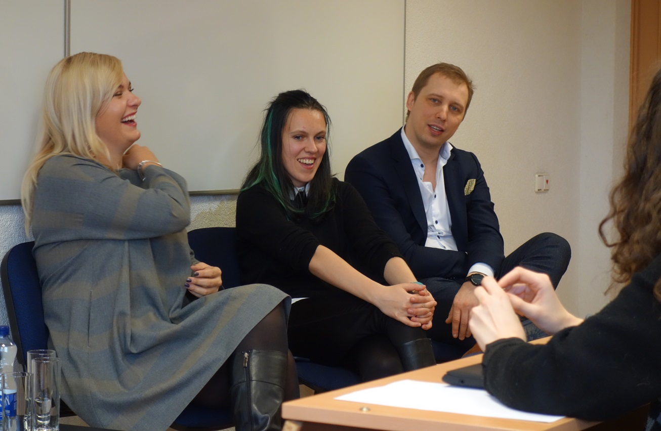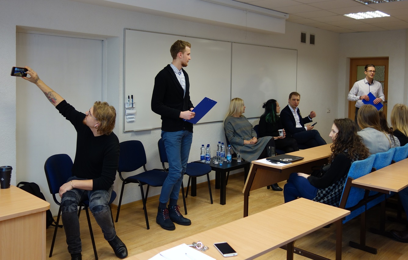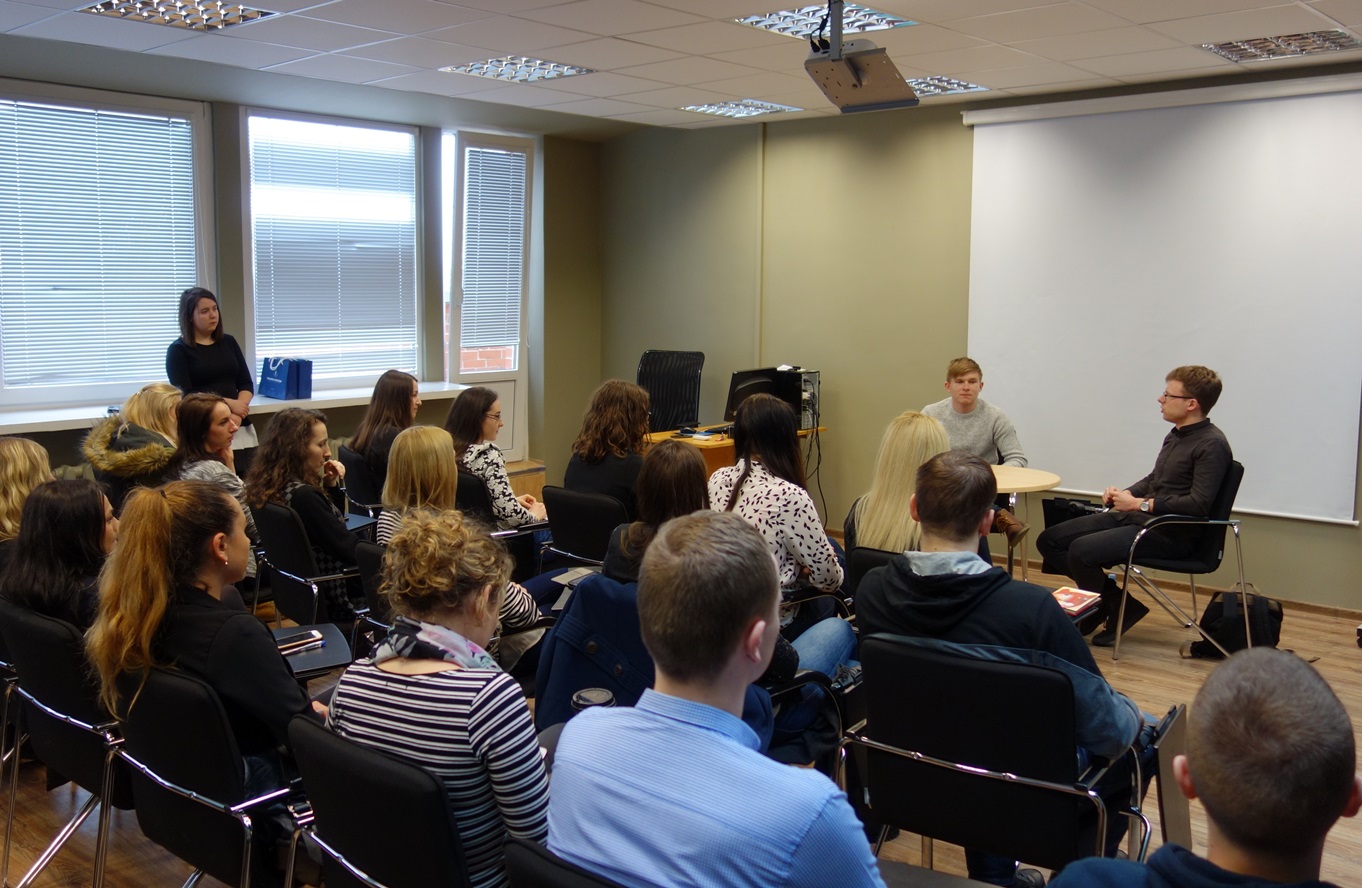 Vasario 23 dieną nuo ryto iki vakaro mūsų laukė išskirtiniai susitikimai, diskusijos, viktorinos ir orientacinės varžybos. Studentai turėjo progos patirties semtis iš: „Startup Lithuania“ projektų vadovės Rimantės Ribačiauskaitės, Internetinės drabužių bei aksesuarų prekybos ir mainų platformos „Vinted“ Klientų aptarnavimo skyriaus vadovo Aurimo Klimavičiaus, vieno garsiausių Lietuvos baldų dizainerių, projekto „SPYNDI“ autoriaus Mindaugo Žilionio, prekės ženklo „Briedis tu“ kūrėjų Igno ir Gusto Klėjų, individualios įmonės savininko Evaldo Čirbos. Diskusijoje „Moterys ir vyrai verslo pasaulyje“ mintimis ir įžvalgomis dalinomės su Milda Mitkute – internetinės drabužių bei aksesuarų prekybos ir mainų platformos „Vinted“ įkūrėja, Alvyde Palaimaite – portalo „Beta.lt“ įkūrėja, Robert Kalinkin – drabužių dizaineriu ir verslininku, Andriumi Baranausku – UAB „Tele2“ korporacinės komunikacijos direktoriumi Baltijos šalims.