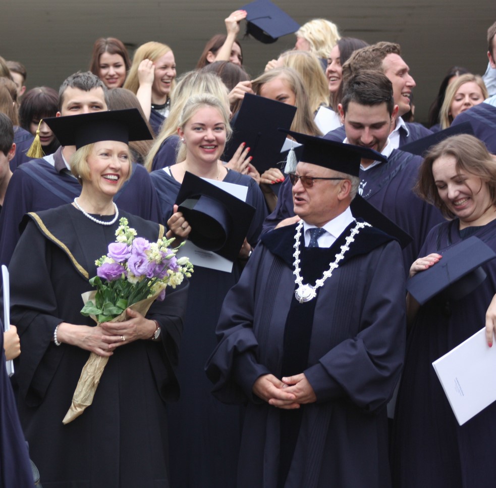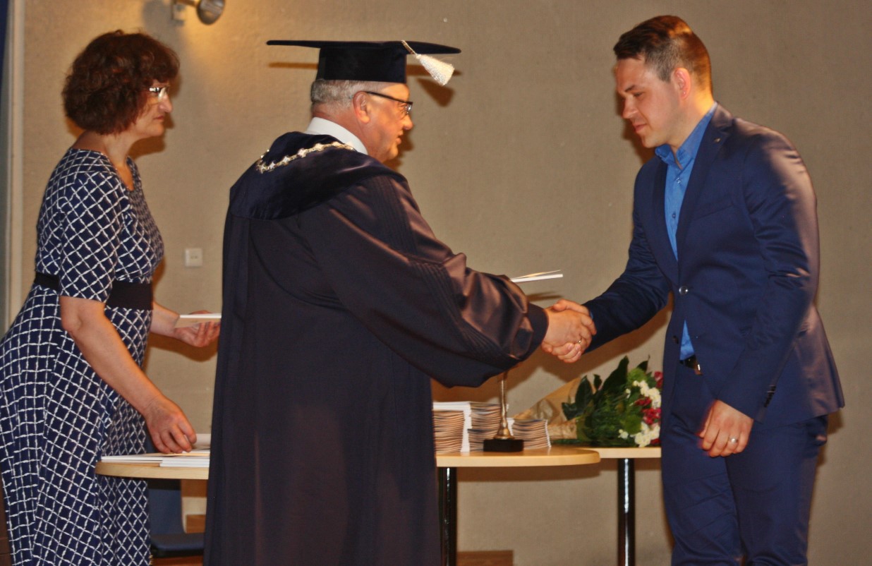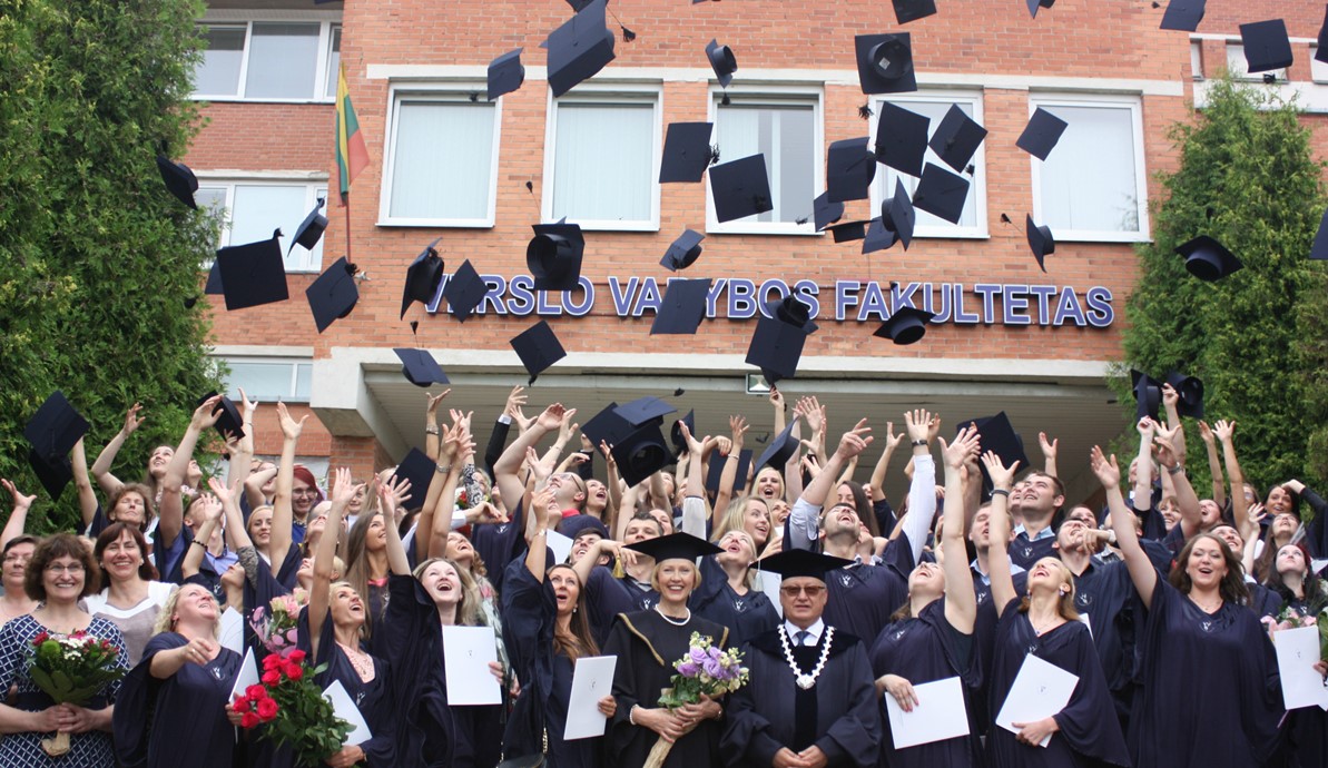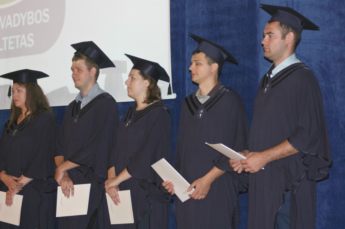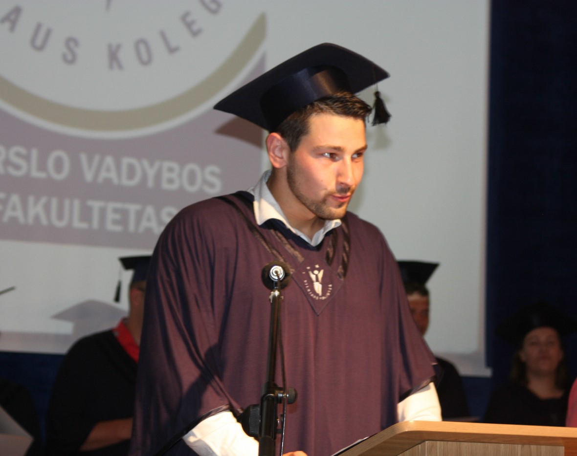 Šią savaitę Verslo vadybos fakultetas išleido 86 ištęstinių studijų absolventus. „Man yra garbė pasirašyti ant kiekvieno iš jūsų diplomo asmeniškai, šiandien jūs esate nugalėtojai, čia susirinko patys stipriausi, ištvermingiausi. Vilniaus kolegijos diplomo gavimas – tai ne pabaiga, o tik naujo kelio pradžia. Sėkmės jūsų tolimesniame, kartais sudėtingame, bet įdomiame kelyje“, – įteikdamas viešbučių ir restoranų verslo, tarptautinės prekybos, turizmo vadybos, reklamos vadybos, įstaigų administravimo ir tarptautinio verslo ištęstinių studijų absolventams profesinio bakalauro diplomus linkėjo Kolegijos direktorius dr. Gintautas Bražiūnas.