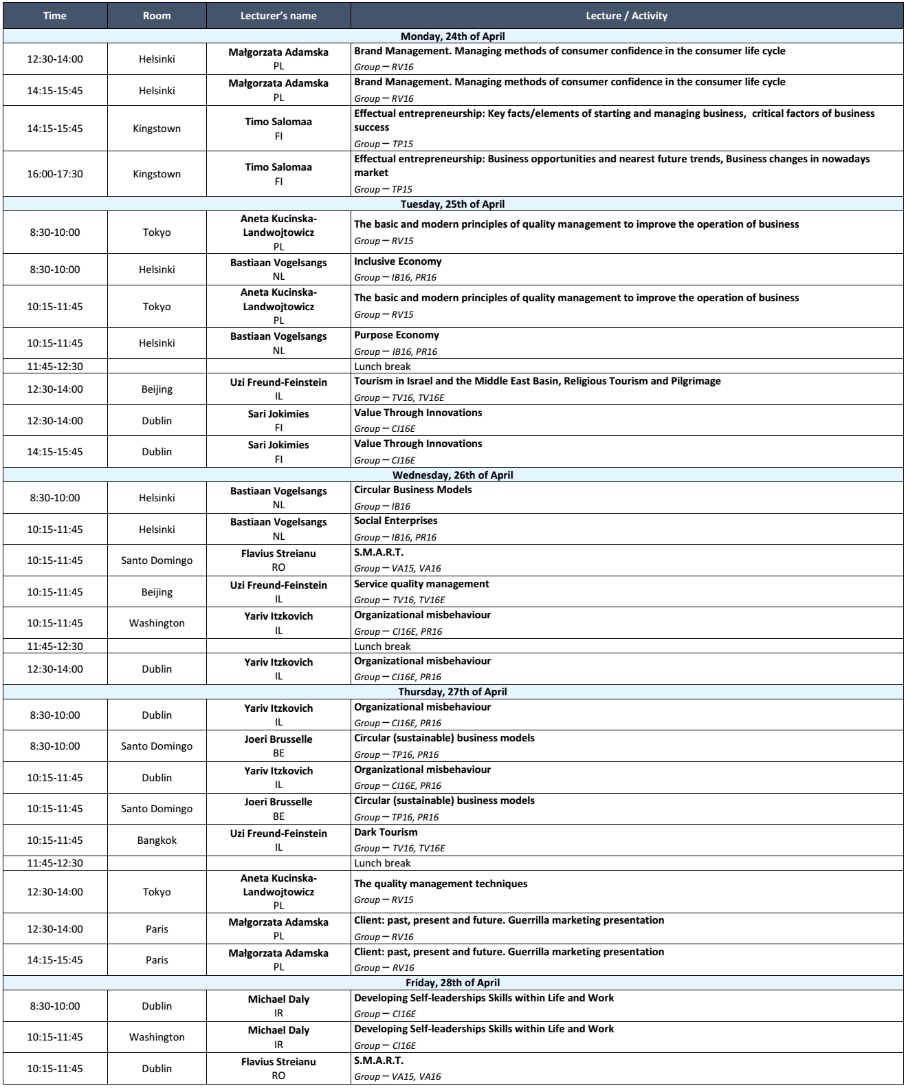 2017 m. balandžio 24–28 d. Vilniaus kolegijoje vyks TARPTAUTINĖ SAVAITĖ, kurios metu į Verslo vadybos fakultetą skaityti paskaitų atvyksta dėstytojai iš įvairių užsienio institucijų. Sulauksime svečių iš Nyderlandų karalystės, Airijos, Izraelio, Suomijos, Belgijos, Lenkijos ir Rumunijos.