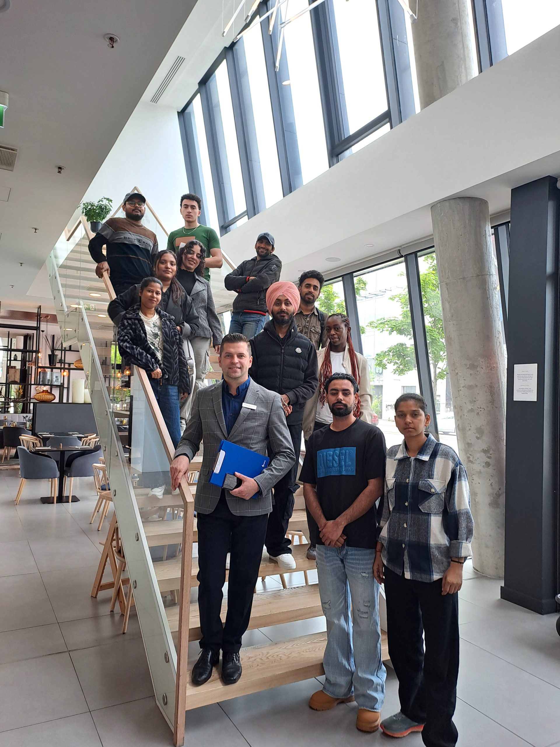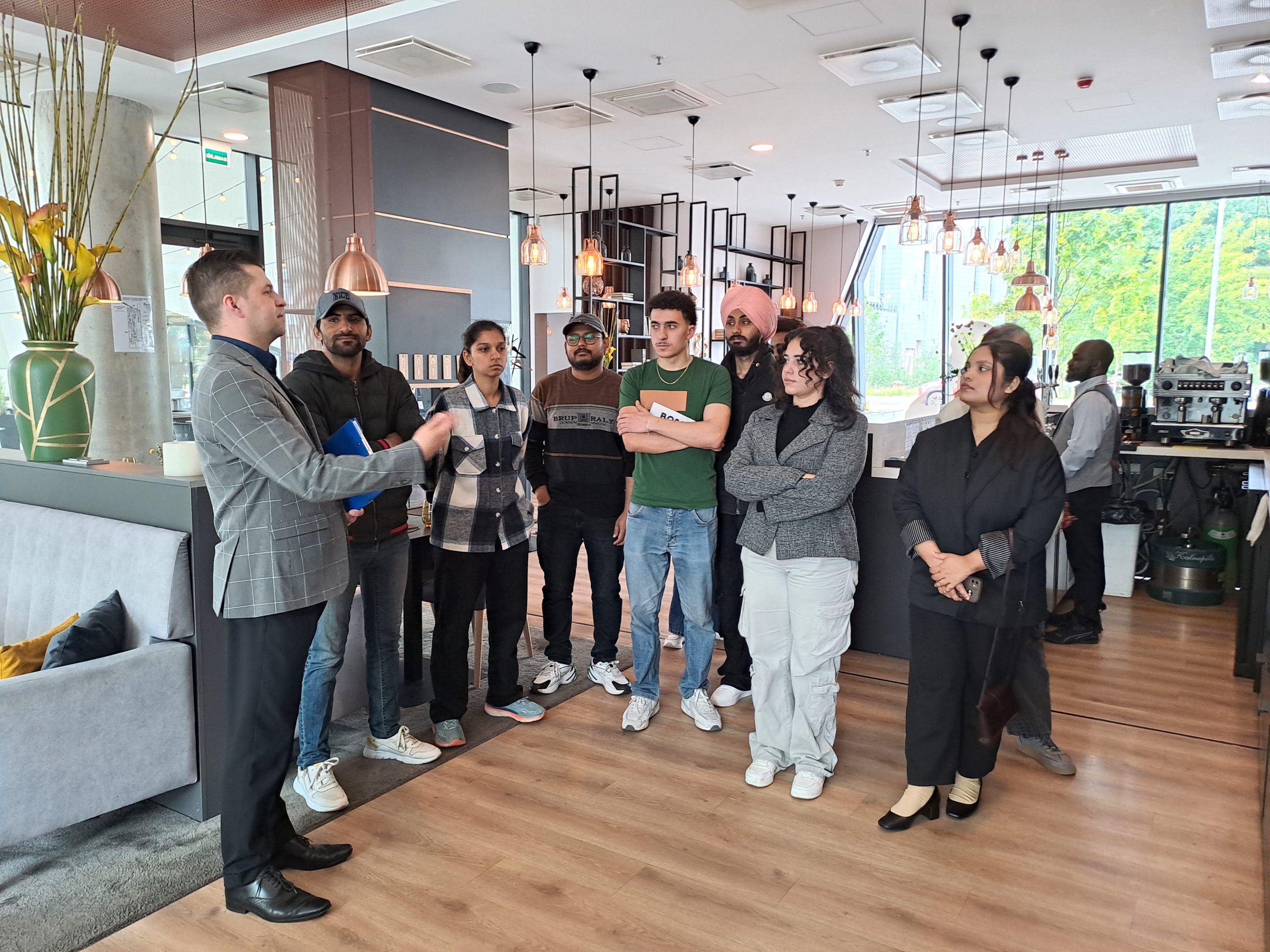 Studentus šiltai sutiko ir lydėjo žmogiškųjų išteklių vadybininkas Aleksandras Liovinas, kuris ne tik pristatė viešbučio ir restorano kasdienybę, bet ir atsakė į daugybę studentų klausimų apie praktikos ir įsidarbinimo galimybes.