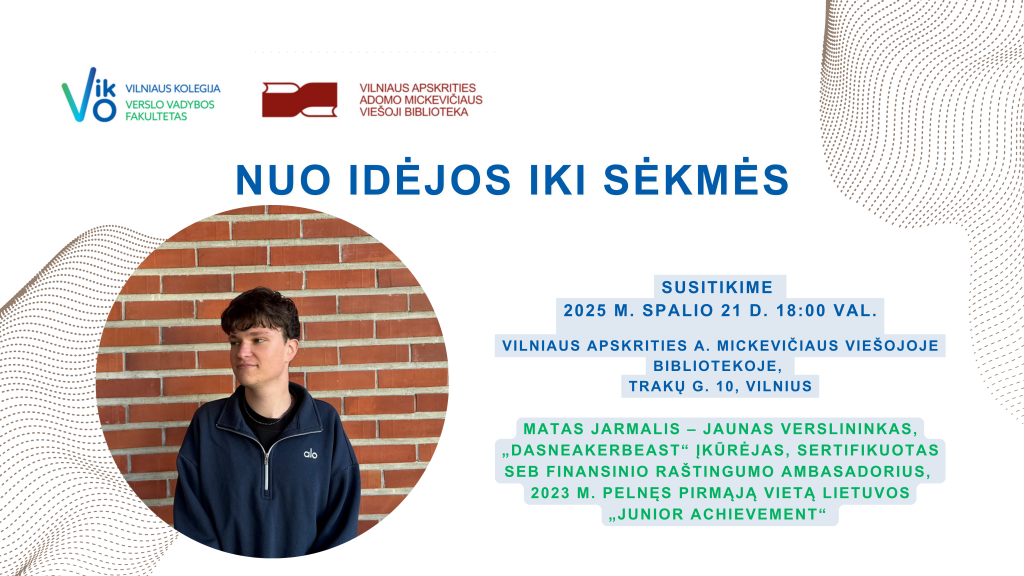 Vilniaus kolegijos Verslo vadybos fakulteto Tarptautinio verslo studijų programos studentai kviečia dalyvauti verslumo skatinimo renginyje „Nuo idėjos iki sėkmės“, kuris vyks 2025 m. spalio 21 d. 18 val. Vilniaus apskrities Adomo Mickevičiaus bibliotekoje, adresu Trakų g. 10, Vilnius.